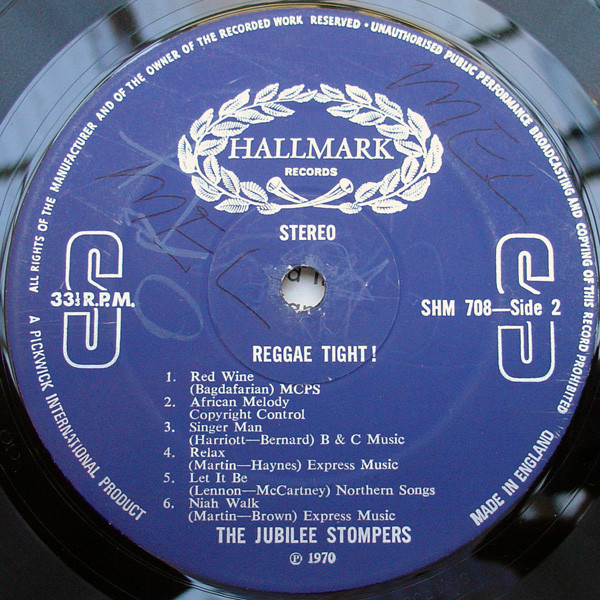 Eight years ago saxophonist KEN PATTON arrived in Britain from his native sunny island of Jamaica. Full of hopes and ambition, Ken soon found able and willing friends in London and the “Jubilee Stompers” were born. In those days they played mainly Jazz, hence “Stompers” but they changed their music to Latin-American, progressed to Soul and when ‘Reggae’ became the craze in the hectic and smokey atmosphere of the clubs and discotheques, they changed their style to suit their fans. In a very short time this eight piece outfit, still known as the “Jubilee Stompers”, were in great demand and their happy and infectious performances have delighted audiences both at home and abroad. On this L.P., Ken and his boys reproduce a great Reggae sound that is a must for every party. So stop “CRYING”, “RELAX”, have a glass of “RED WINE”, forget the “SUFFERING IN THE LAND” and REGGAE TIGHT!